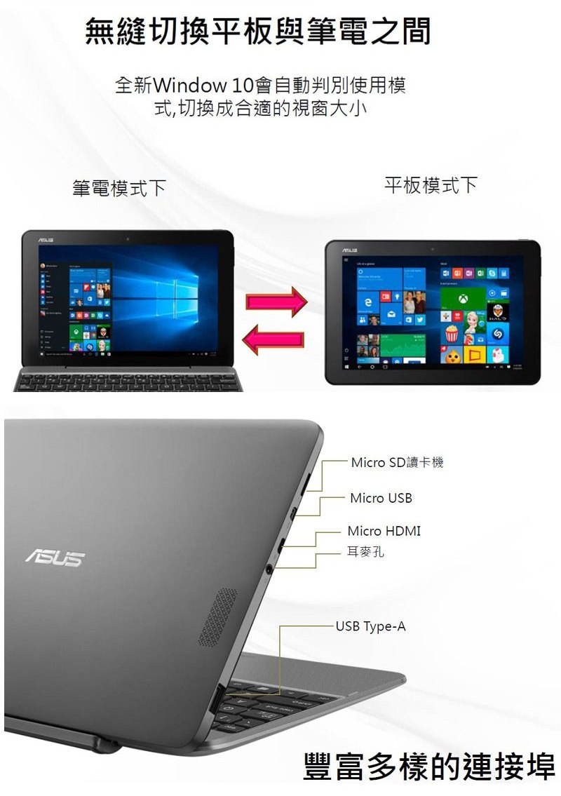 時尚設計,完美隨型輕薄機身, 0.58kg (配備 2 cell 電池)音效: built-in 喇叭和麥克風讓你擁有超強行動力12 小時的電池續航力, 7890 mAh更聰明的 USB1 x Microphone-in/Headphone-out jack1 x USB 2.0 port(s)1 x USB-C Gen 1 (up to 5 Gbps)1 x Micro USB1 x micro HDMIWindows 10 預先安裝卓越效能2年全球保固